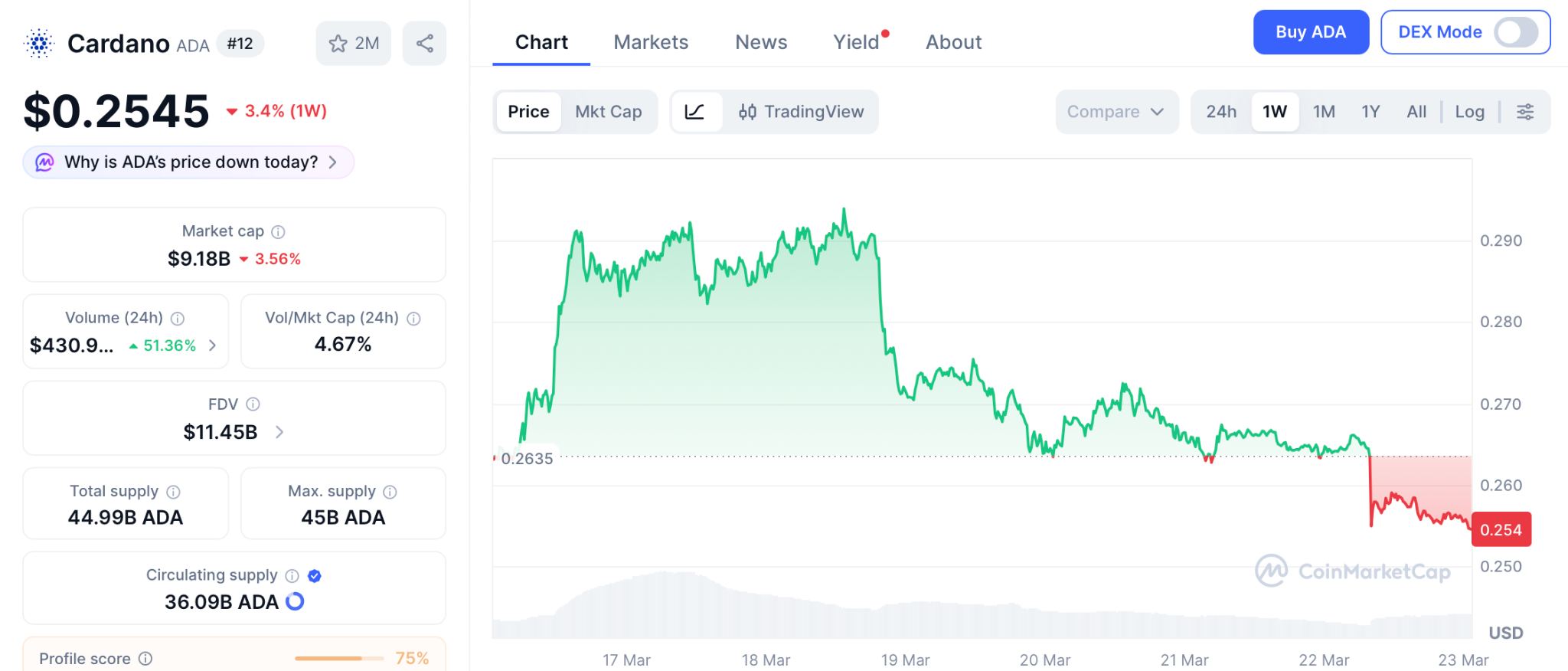 ADA diperdagangkan sekitar $0.2545 pada 22 Maret, turun dari $0.29 di awal bulan ketika pasar yang lebih luas koreksi seiring dengan guncangan minyak Iran, menurut CoinMarketCap.